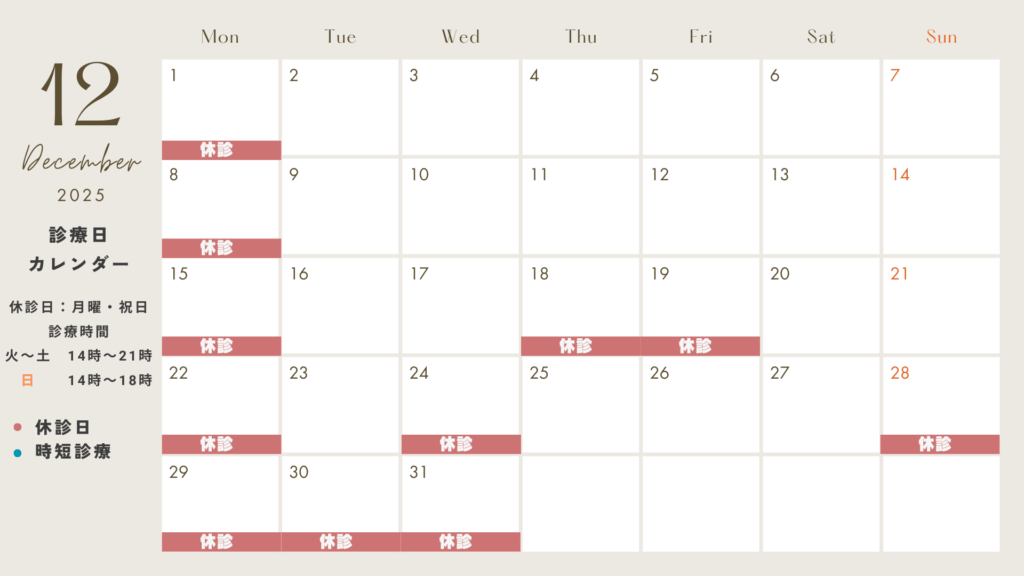 皆様には日頃より、当クリニックをご利用いただき、誠にありがとうございます。2025年12月の診療日程に関して、以下の通りお知らせいたします。