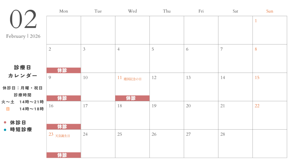 2026年2月の診療日程に関して、以下の通りお知らせいたします。